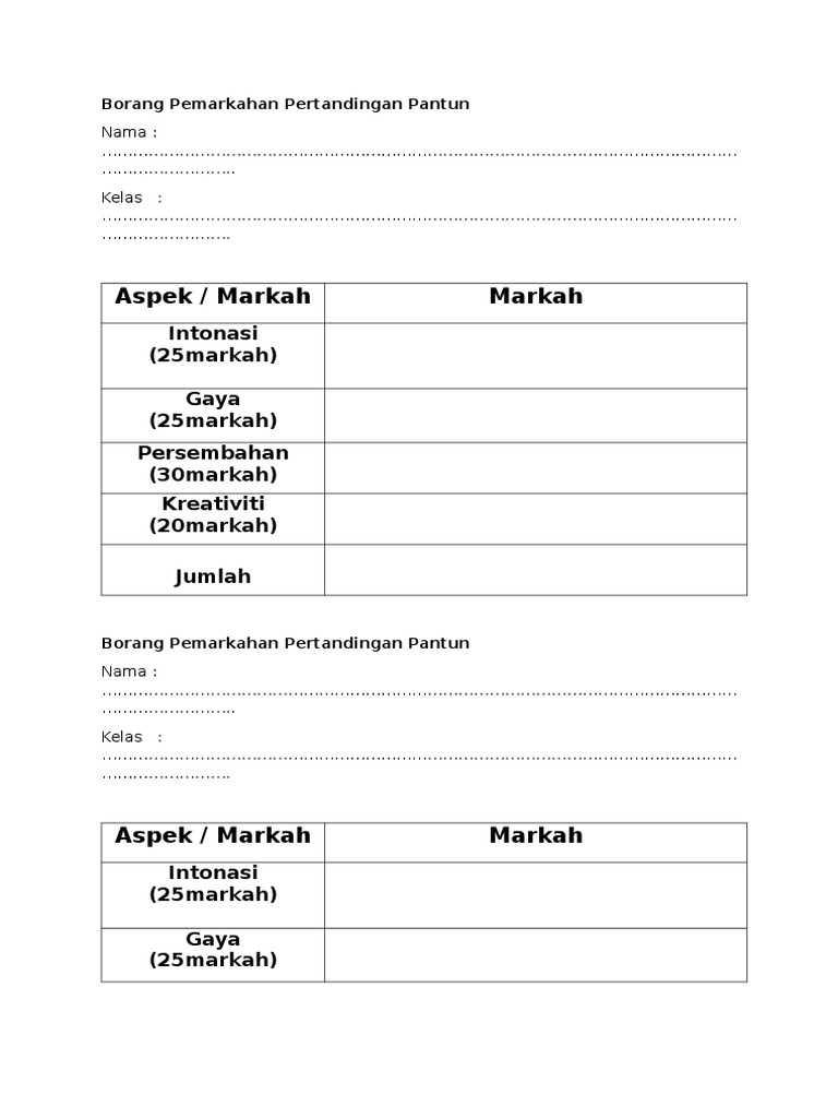 Borang Pemarkahan Pertandingan Pantun Pdf